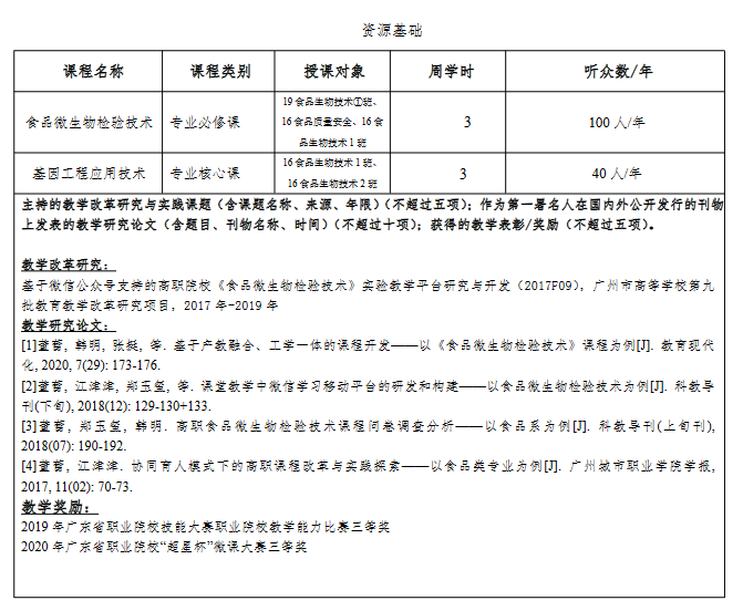教师教学团队 本教学团队由 5 名教师组成,其中 4 名专任教师、1 名企业兼职教师。 课程负责人为中国科学院研究生院分子生态学博士、华南农业大学生物学 博士后流动站博士后,具有丰富的分子生物学实验操作经验和课题研究经验。 教学团队中均具有硕士及以上学…